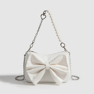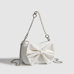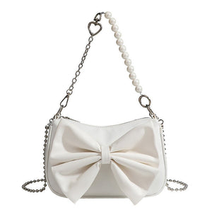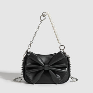 Black White PU Bow Handbags Autumn Winter Ladies Underarm Tote Bags Fashion Simple Pearl Chain Shoulder Bag Small Purse